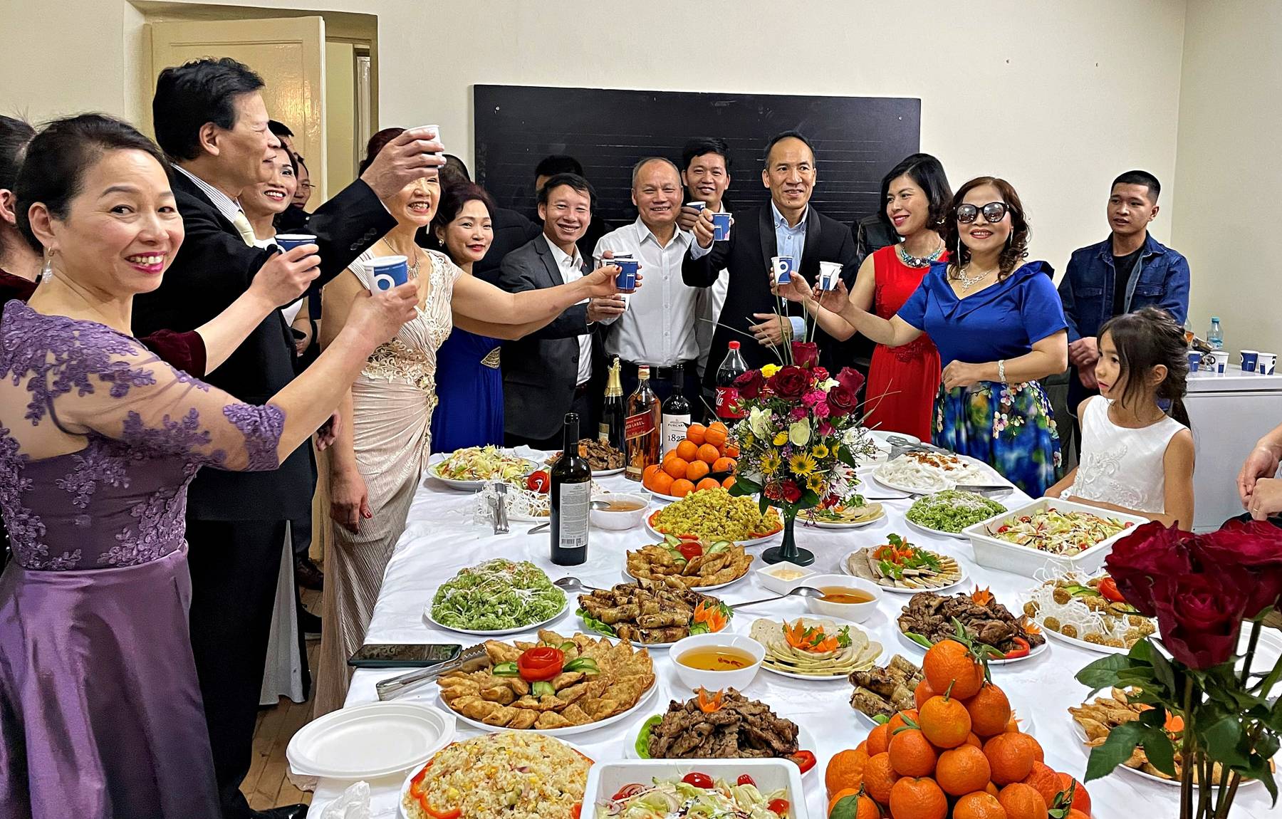 Ngay từ rất sớm, chị em đã đến hội trường để trang trí, bầy biện đồ ăn do chính tay mình làm. Chị Đặng Tuyết đã ủng hộ một số nguyên liệu thực phẩm. Chị Nguyễn Phương ủng hộ giò chả. Vợ chồng anh Nguyễn Hữu Tuyến – lãnh sự phụ trách về vấn đề bảo hộ công dân và phụ trách Cộng đồng ủng hộ 2 két rượu vang. Chị Phạm Mai Thủy lên thực đơn vô cùng phong phú. Bàn ăn thêm rực rỡ dưới đôi bàn tay khéo léo của chị Nguyễn Quỳnh, chị Mai Thủy và một số chị em khác.
