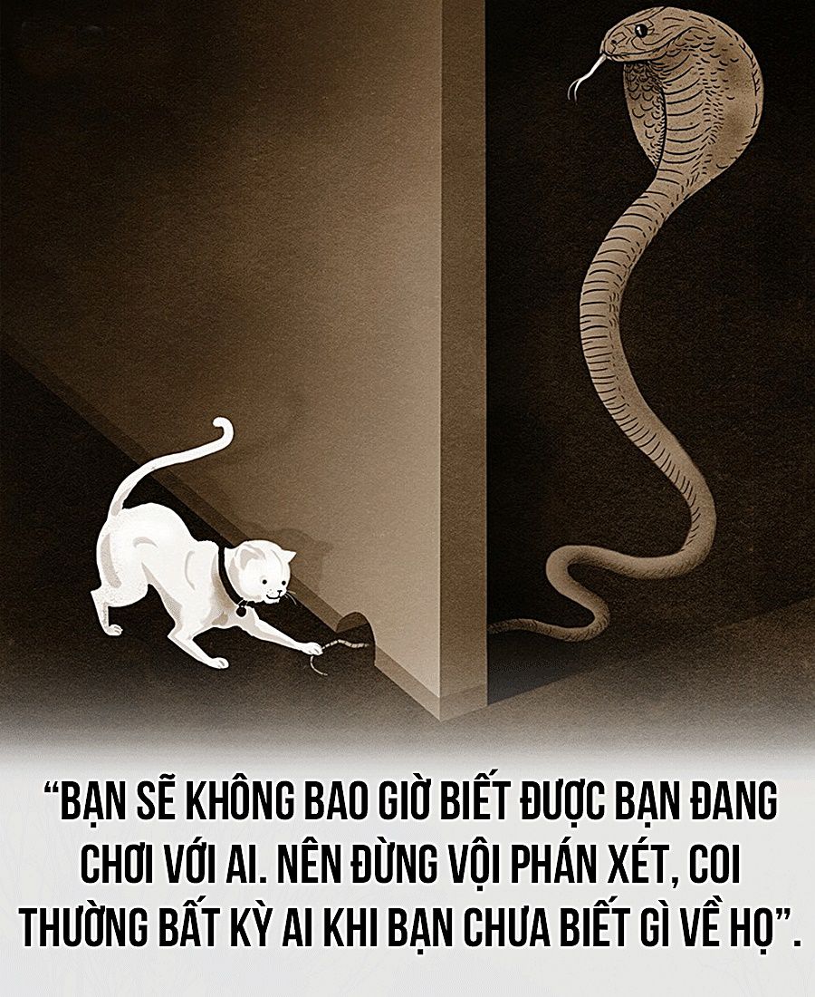 Trước đây, tôi xem bức ảnh này nhưng không hiểu hết ý nghĩa, chỉ biết là chú mèo thấy cái đuôi rắn thò ra từ 1 cái lỗ bé và chú mèo cứ nghĩ đó là đuôi chuột, lấy chân vờn định kéo ra.