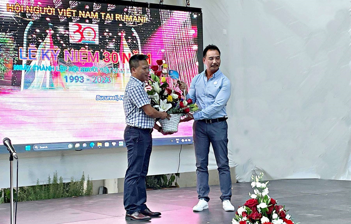 Nguyên Đại sứ Việt Nam tại Romania Nguyễn Quang Chiến tặng hoa và chúc mừng Hội.