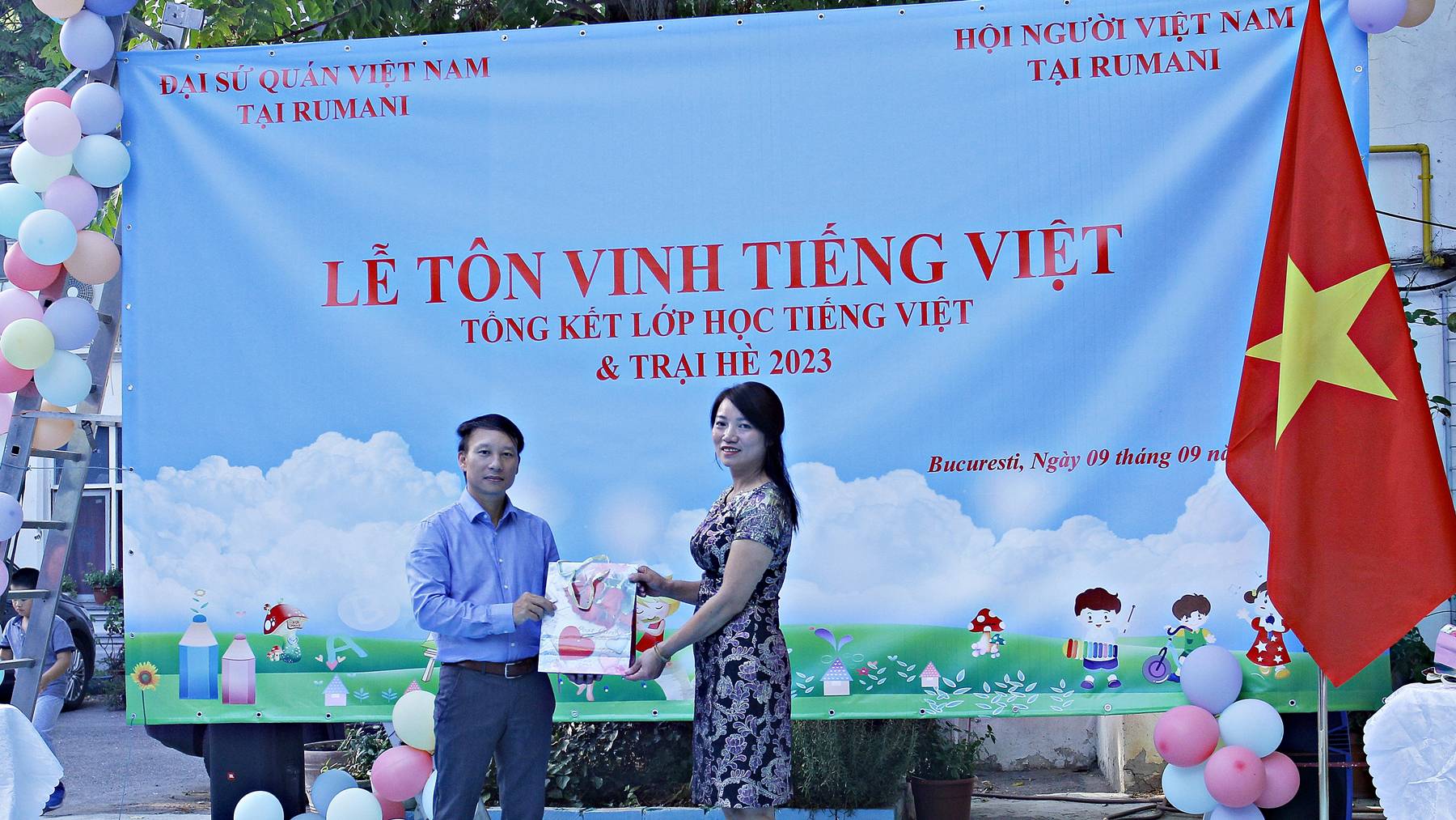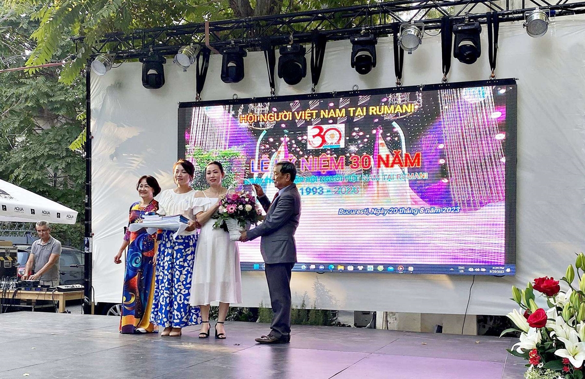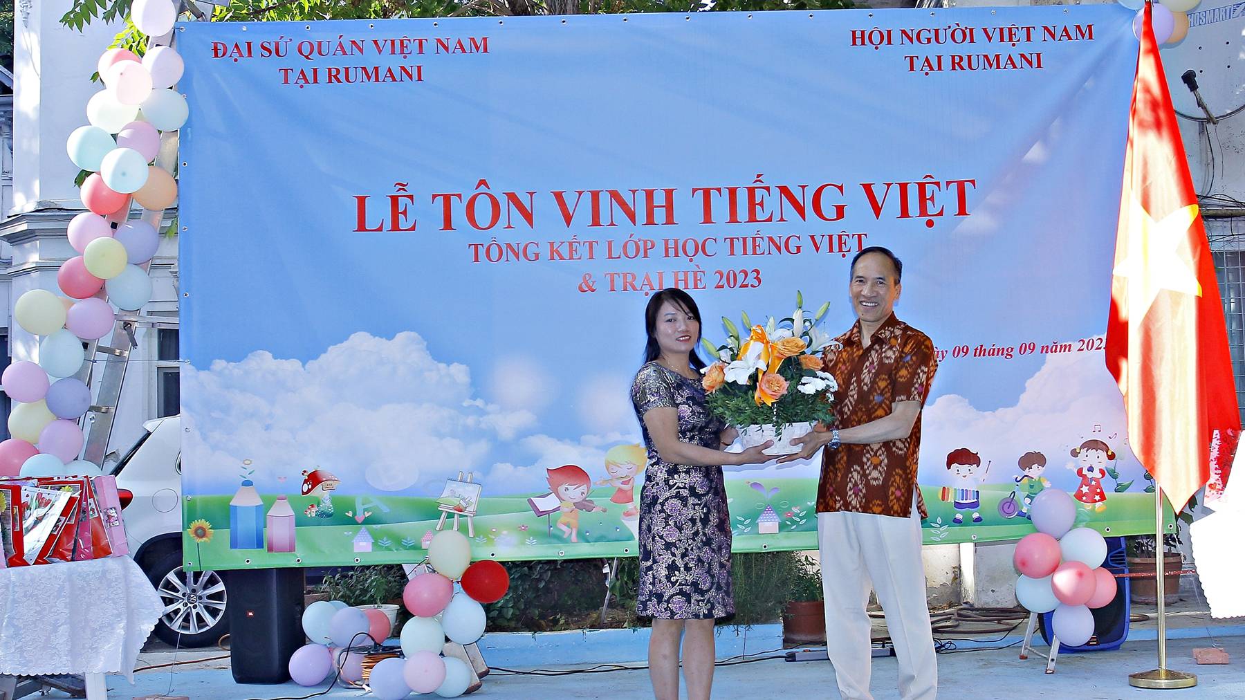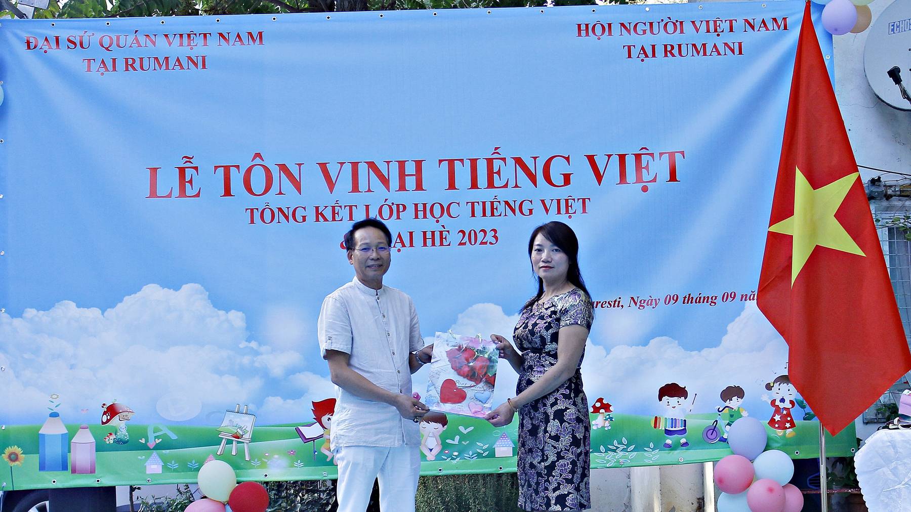 Cũng trong Lễ kỷ niệm 30 năm ngày thành lập Hội Người Việt, thay mặt Hội Hữu nghị Việt Nam-Rumani, ông Hoàng Trung Du-Phó Chủ tịch Hội đã trao cho bà Phạm thị Mai – Trưởng Ban tổ chức Lớp học tiếng Việt sách học tiếng Việt cho các cháu và trao cho bà Lê Thị Hương lẵng hoa chúc mừng HNV.