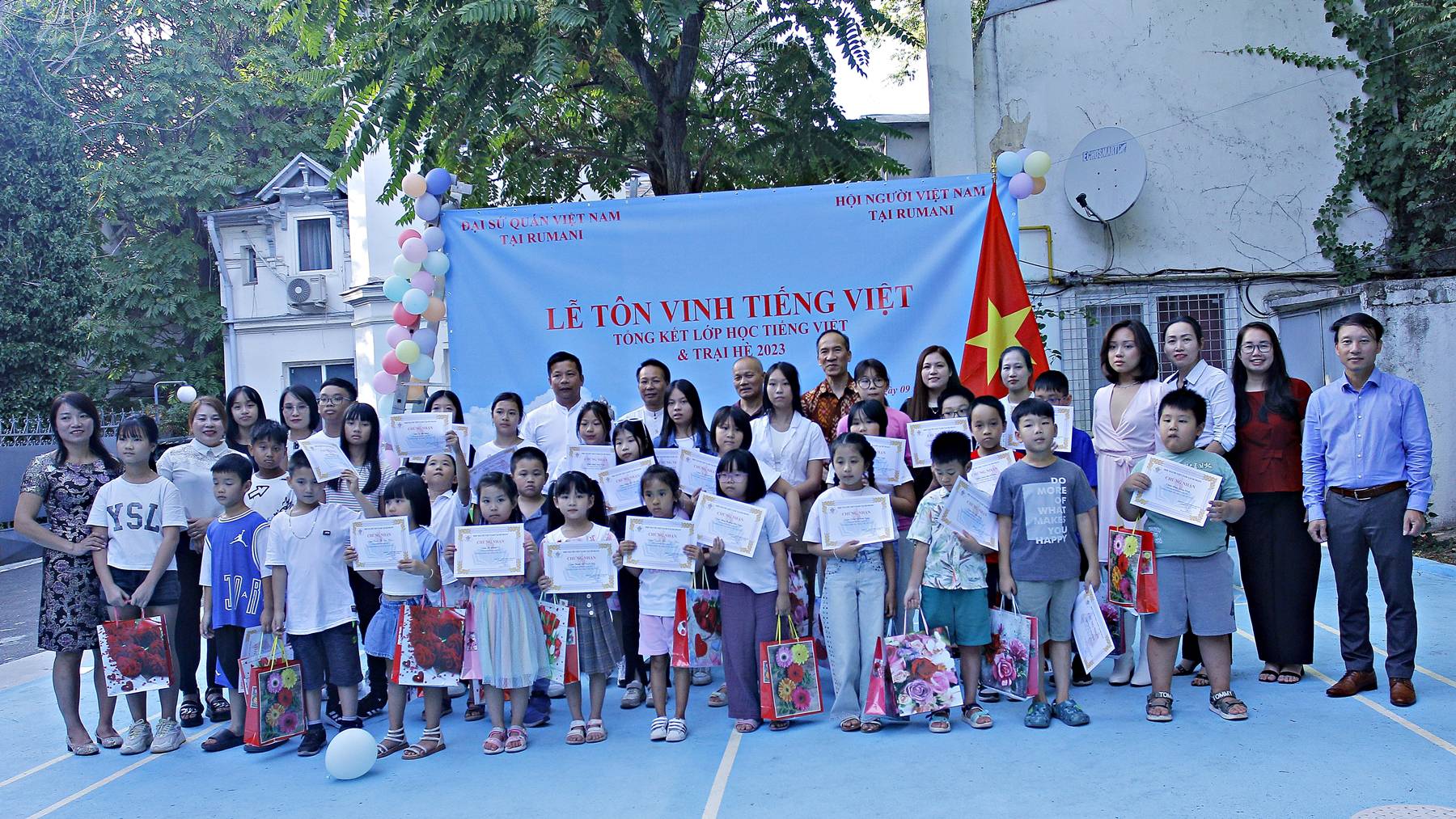 Cũng như mọi năm, Lớp học tiếng Việt năm nay đã khai giảng vào ngày 20 tháng 6 tại trụ sở ĐSQ Việt Nam tại Romania với 40 em học sinh, chia làm 3 lớp theo trình độ khác nhau. Các cô Nguyễn Hồng Hà và Lê Thị Hương phụ trách lớp Bé. Cô Hoàng Quỳnh Liên phụ trách lớp Nhỡ. Các cô Phạm Thị Mai, Phạm Thị Thu Hà phụ trách lớp Lớn.