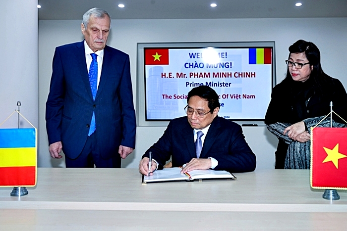 Thủ tướng Chính phủ Phạm Minh Chính ghi sổ lưu niệm khi thăm, làm việc tại Phòng Thương mại và Công nghiệp Prahova – Ảnh: VGP/Nhật Bắc