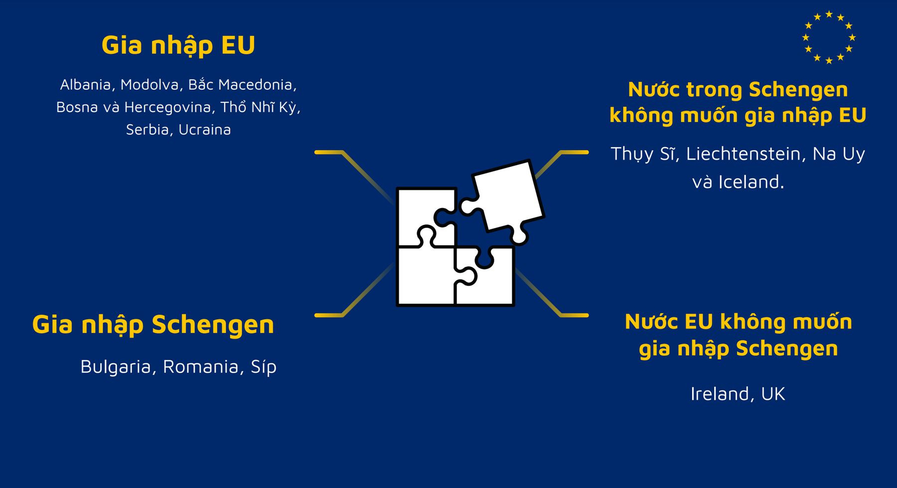 – Nước trong Schengen không muốn gia nhập EU: Thụy Sĩ, Liechtenstein, Na Uy và Iceland.