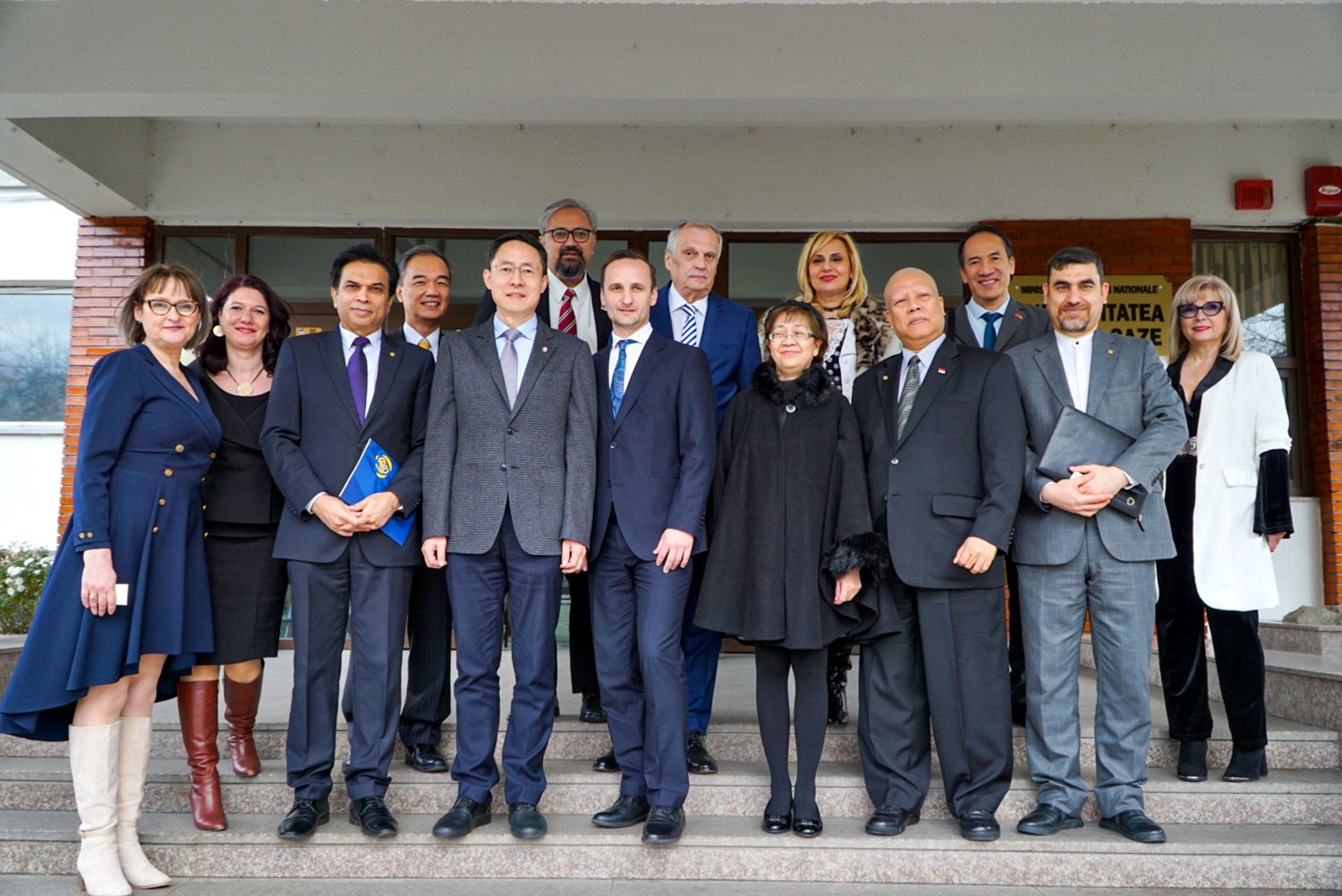 (Ảnh: Các Đại sứ chụp ảnh lưu niệm với ông Alina Dinita, Hiệu trưởng và Ban Giám hiệu Trường Đại học Dầu khí Ploiesti)