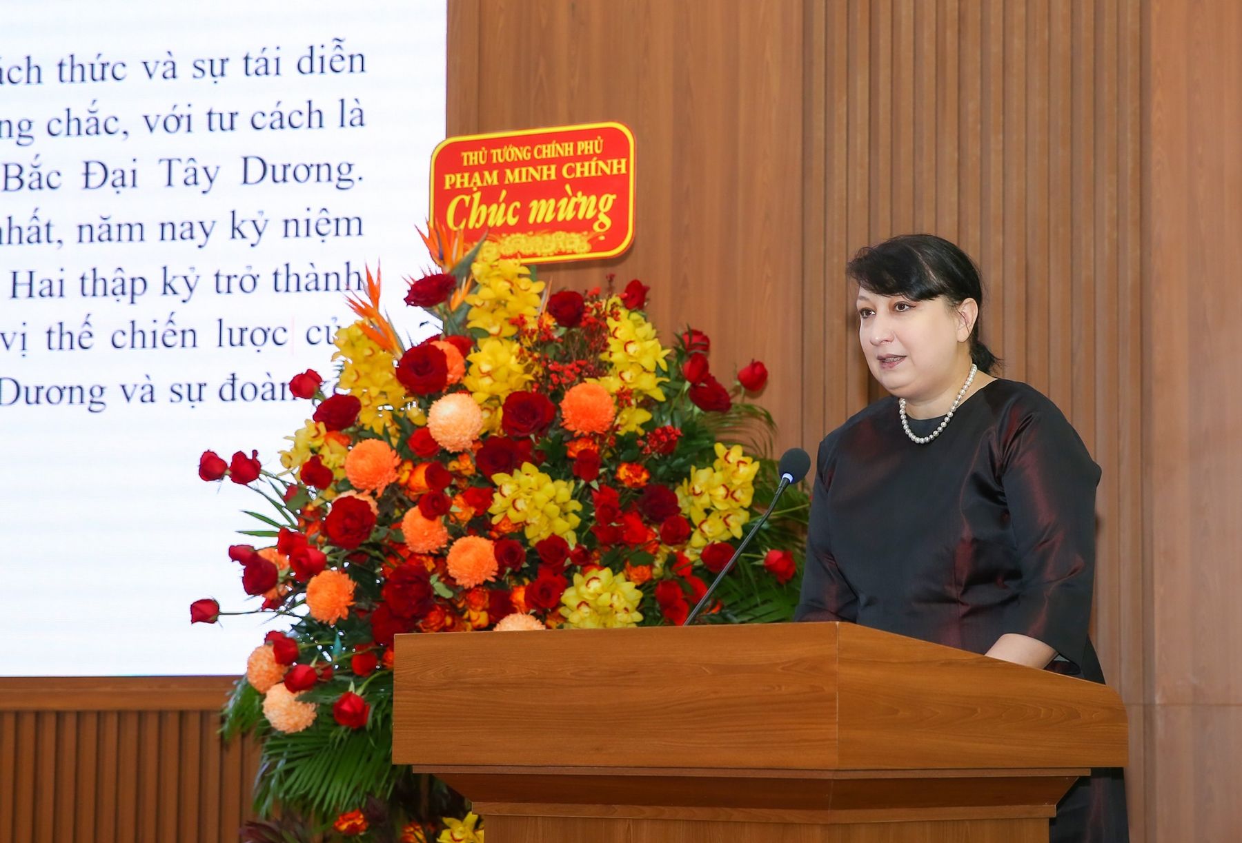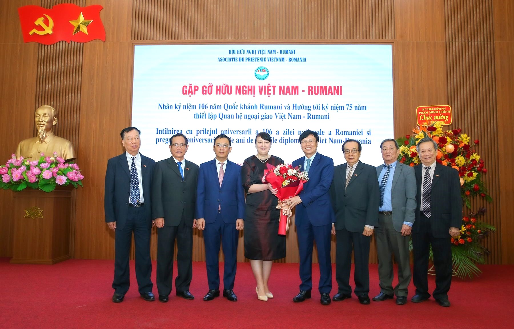 Chủ tịch Hội Hữu nghị Việt Nam-Romania Hồ Quang Lợi trao hoa tặng Đại sứ Cristina Romila.