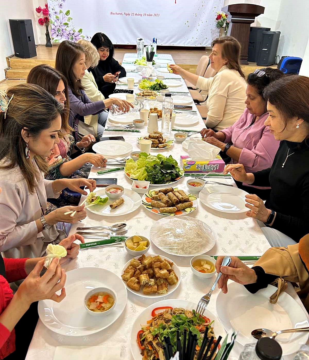 Ngày 08/11/2023, tại Đại sứ quán Việt Nam tại Rumani, Phu nhân Đại sứ Lê Thị Hoa Vân đã chủ trì buổi giới thiệu ẩm thực Việt Nam tới Nhóm Phu nhân Đại sứ đoàn ngoại giao tại Bucharest. Hoạt động đã nhận được sự hưởng ứng, nhiệt tình tham gia của đông đảo các Đại sứ quán, qua đó giúp lan tỏa văn hóa ẩm thực Việt Nam tới bạn bè quốc tế.