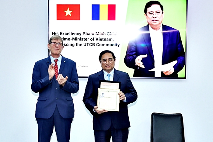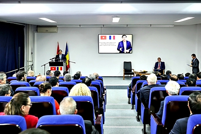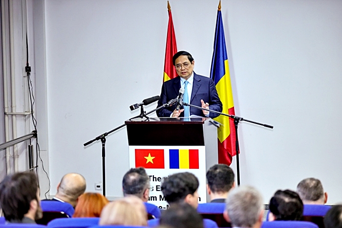 Trong bài phát biểu với ban lãnh đạo nhà trường, các thầy cô giáo, sinh viên và các đại biểu, dành phần lớn thời lượng phát biểu để nói về quan hệ hai nước, Thủ tướng Phạm Minh Chính cho biết Romania là một trong 10 nước đầu tiên trên thế giới công nhận và thiết lập quan hệ ngoại giao với Việt Nam (ngày 3/2/1950); là một trong những quốc gia đầu tiên ủng hộ Việt Nam trong cuộc đấu tranh giải phóng dân tộc và giúp Việt Nam xây dựng, phát triển kinh tế.