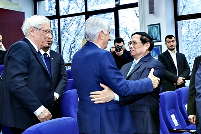 Thủ tướng nhận bằng kỷ niệm (bản sao luận văn, bảng điểm tổng hợp… của Thủ tướng khi theo học) từ lãnh đạo nhà trường – Ảnh: VGP/Nhật Bắc