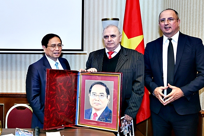 Đại diện Hội Hữu nghị Romania-Việt Nam và các hội đoàn, bạn bè hữu nghị Romania với Việt Nam tặng quà Thủ tướng – Ảnh: VGP/Nhật Bắc