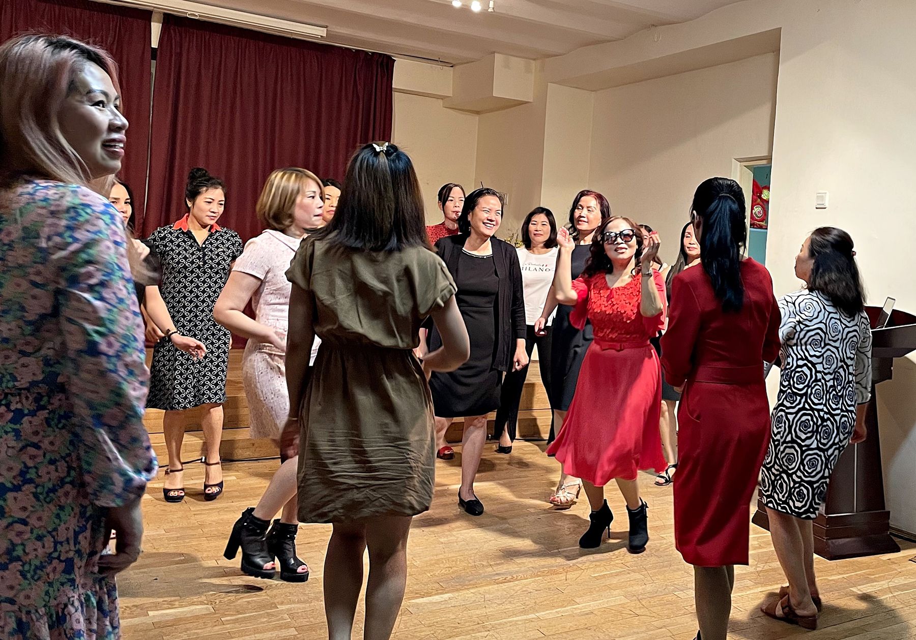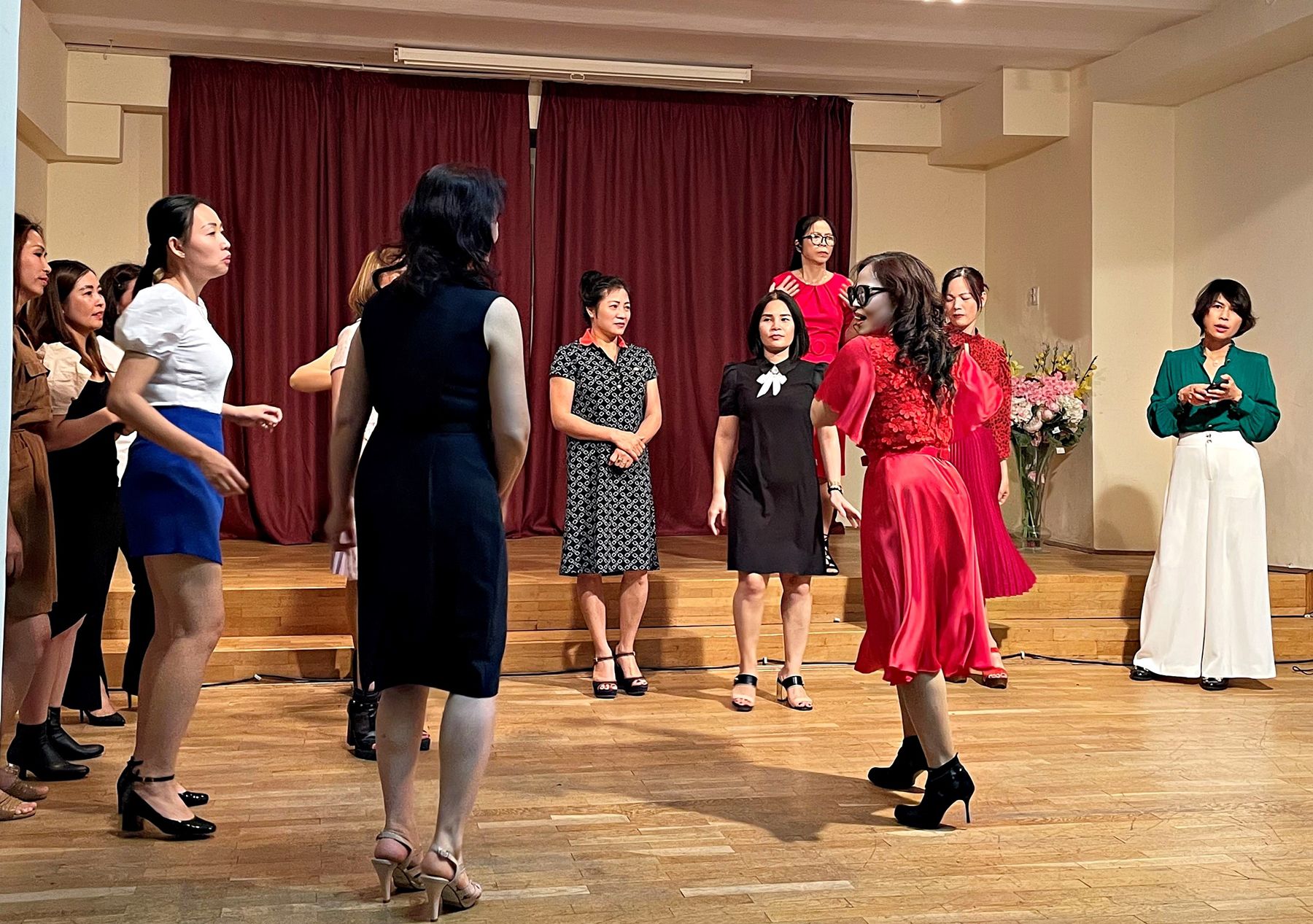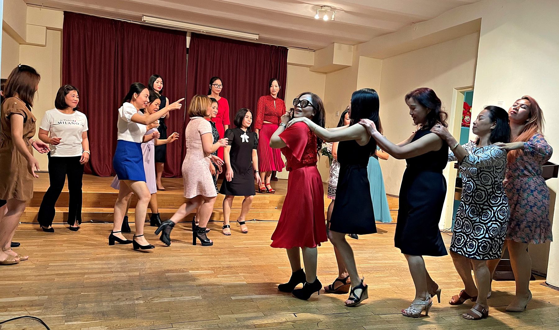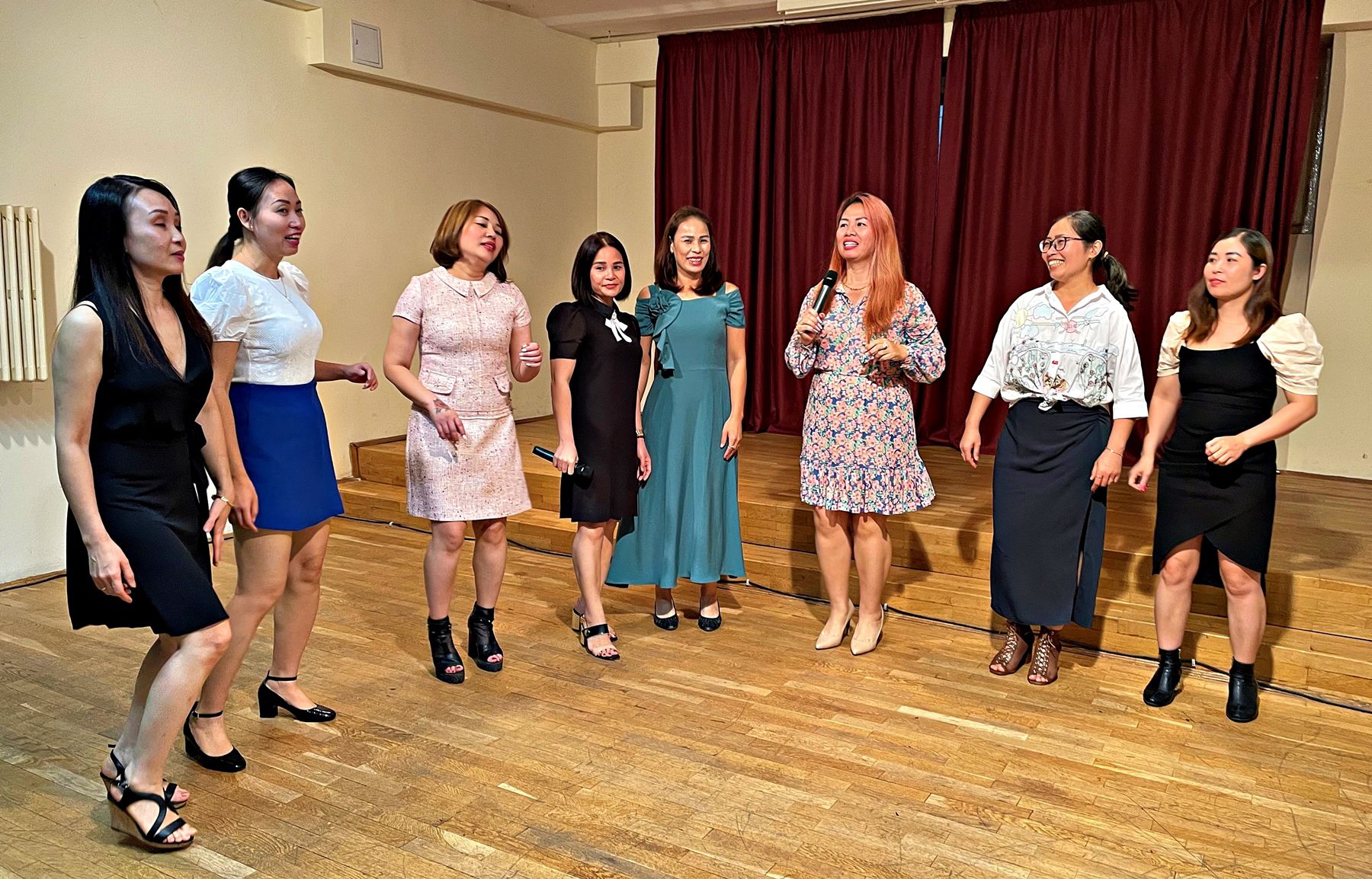 Cuộc thảo luận sôi nổi hẳn lên khi chị em bàn về chủ để sinh hoạt cuối năm. Các ý kiến được đưa ra: <Sắc mầu Phụ nữ>, <Phụ nữ Thanh lịch>… Bí quá, chị em quay sang hỏi Đại sứ. Đúng là <bỏ bom> Đại sứ rồi còn gì! (✿◠‿◠). Đại sứ cười nói: buổi sinh hoạt của chị em, tất nhiên là Phụ nữ rồi. Vậy có thể thay thành <Sắc mầu Việt Nam>?.