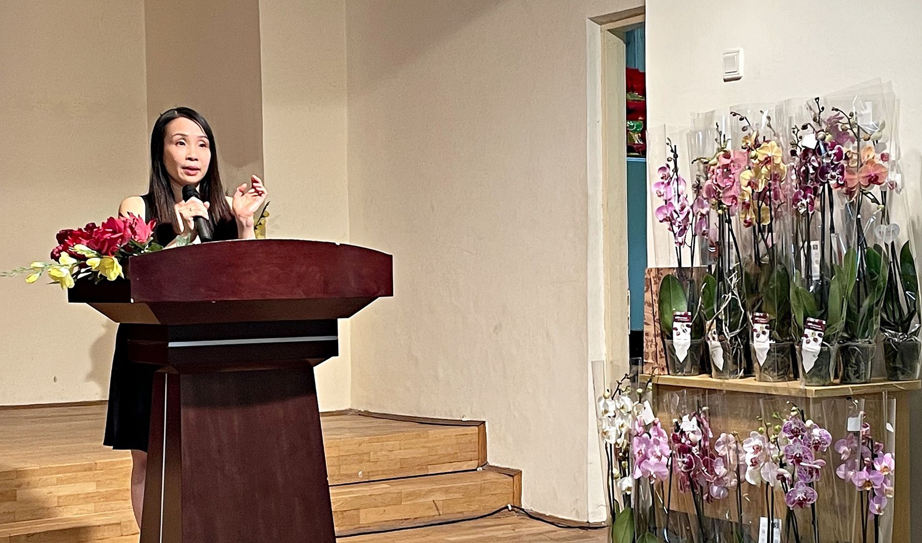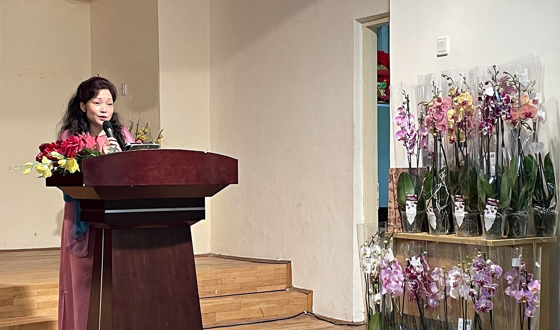 Chị Phạm Hồng Duyên trình bày về kế hoạch buổi tham quan dã ngoại nông trang trồng và sản xuất rượu nho Dropia ở tỉnh Braila, dự kiến vào ngày 11/9.